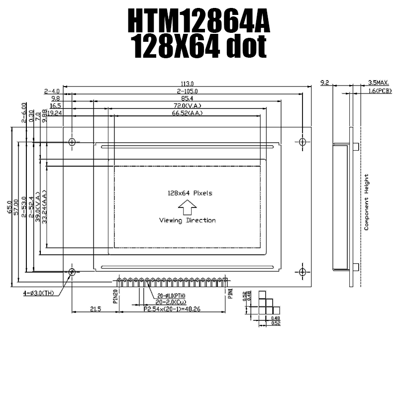 HTM12864A-25W-N5P | Monochrome Graphic COG | 128x64 Pixels | Transflective LCD | Side White Backlight | STN (+) Blue Display | Non-Stocked