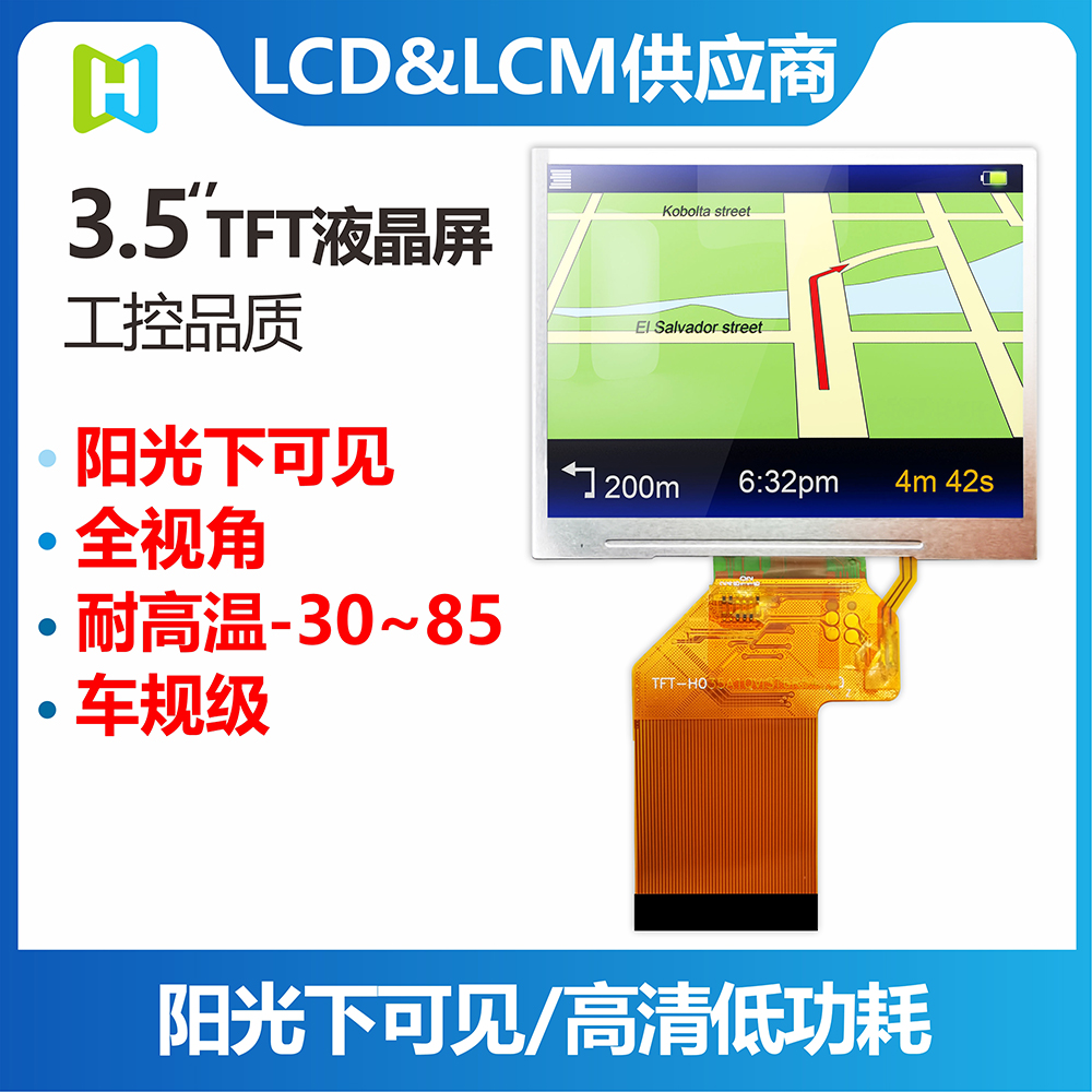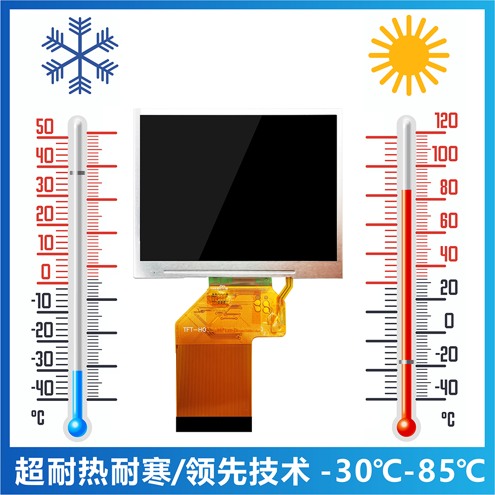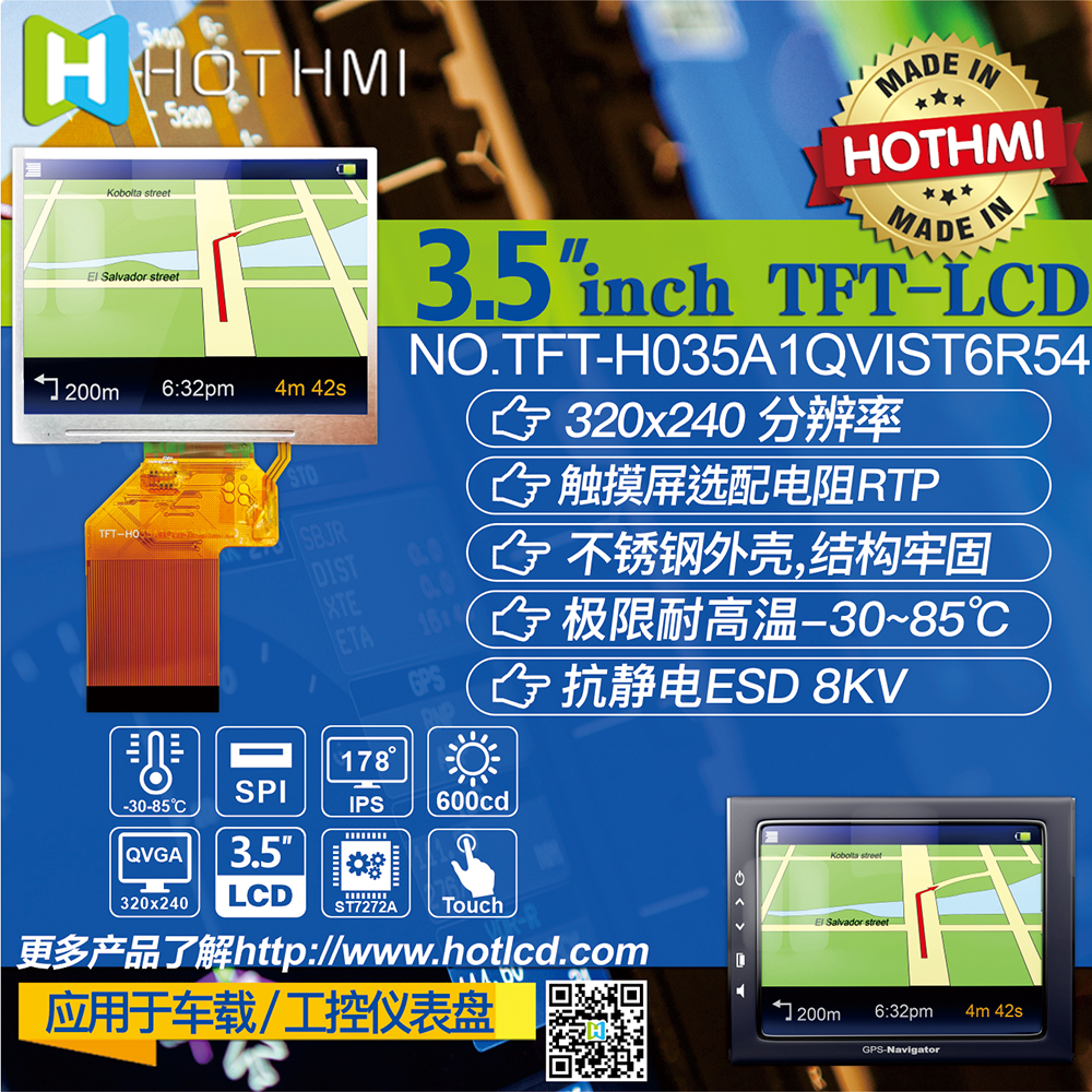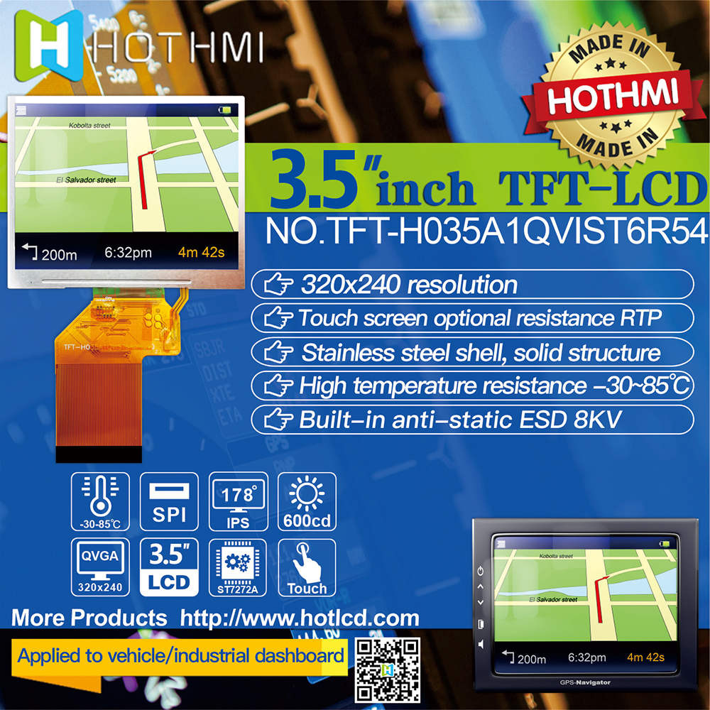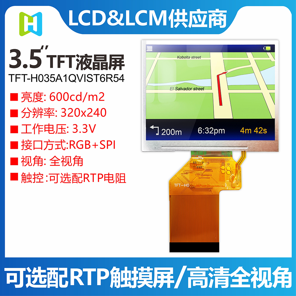 Product Description The TFT-H035A1QVIST6R54 is a 3.5-inch wide temperature IPS TFT-LCD monitor with a projected resistive touch screen with a resolution of 320x240 pixels. The module has built-in ST7272A driver IC and supports RGB interface. TFT-H035A1QVIST6R54 adopts IPS panel, which has the advantage of wider viewing angle, left: 80/right: 80/up: 80/down: 80 degrees (typical), contrast ratio 800:1 (typical), brightness 600 nits (typical) value), glare panel, 4:3 aspect ratio. Support I2C interface and single touch function. The H035A1 model features a projected resistive touch panel (PCAP). The supply voltage (VCC) of the TFT-H035A1QVIST6R54 is 3.0V to 3.6V, with a typical value of 3.3V. It can work in temperatures from -30°C to +85°C and storage temperatures from -30°C to +85°C.