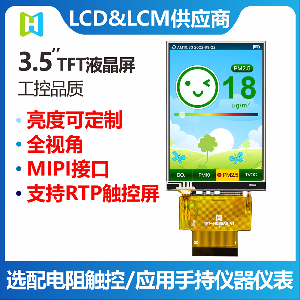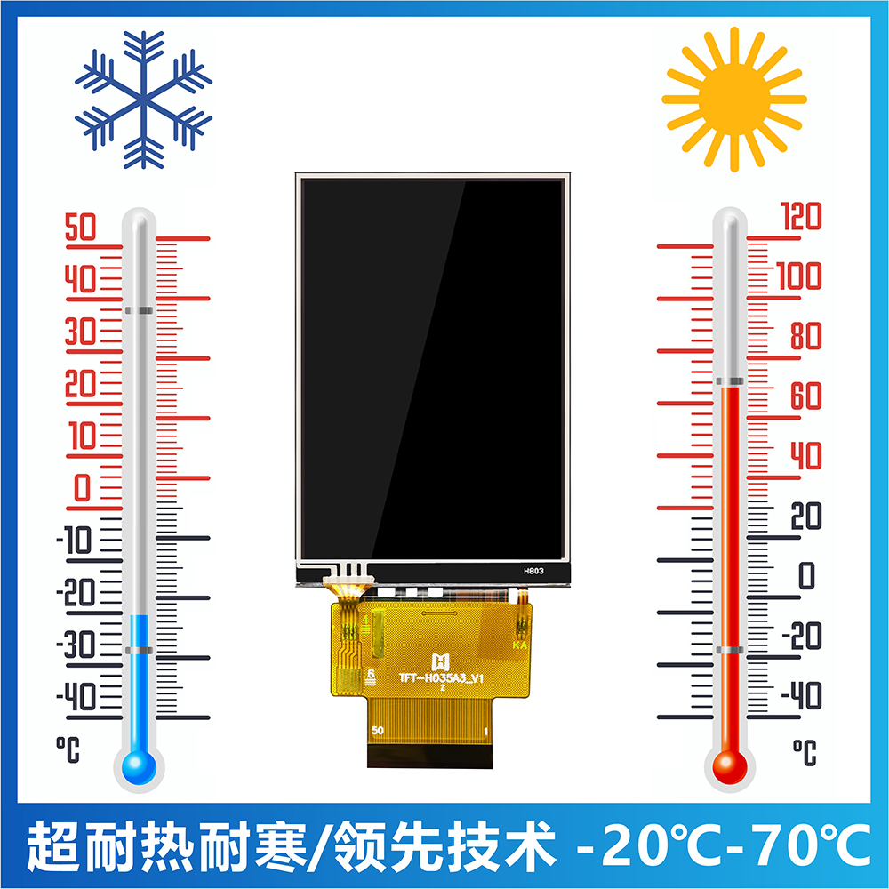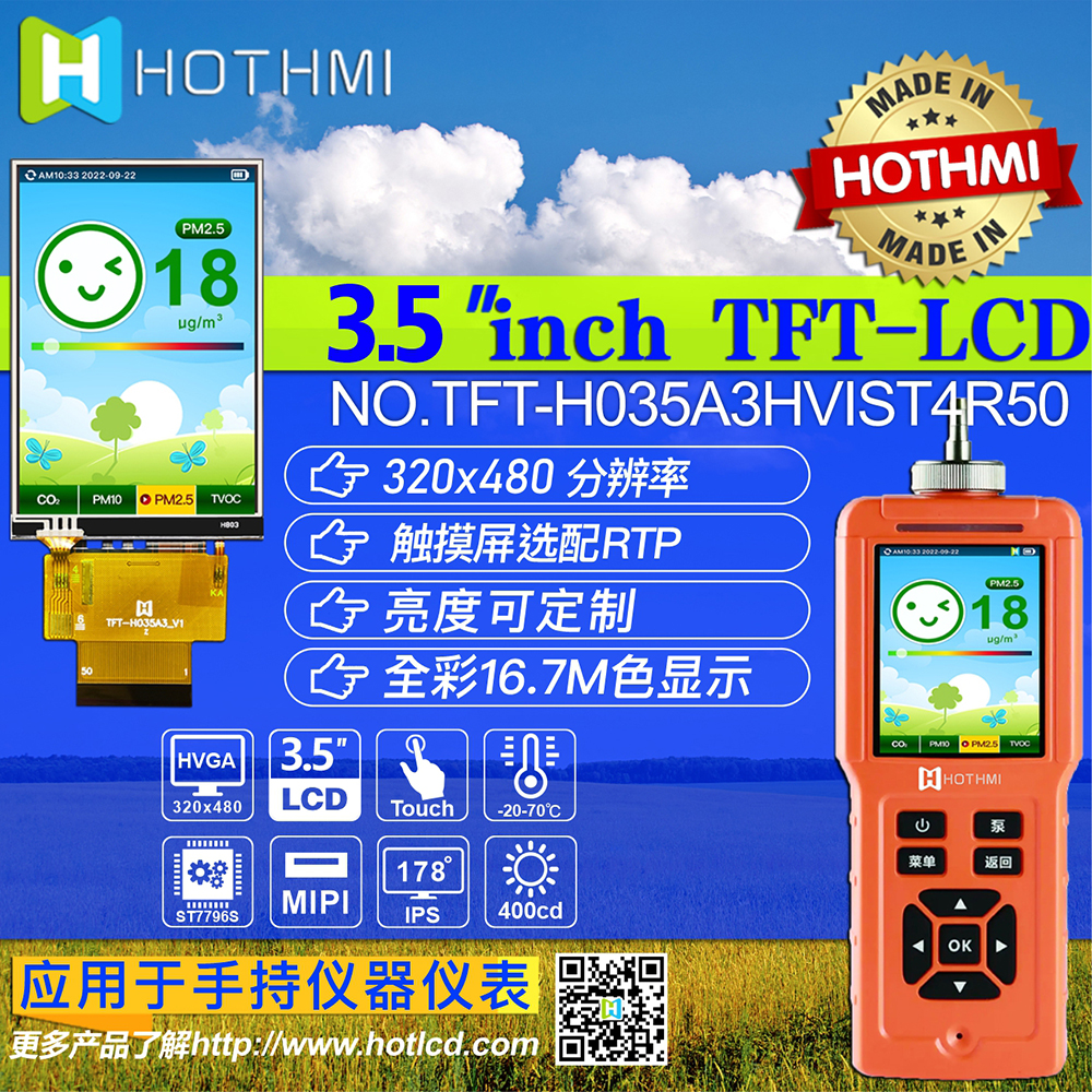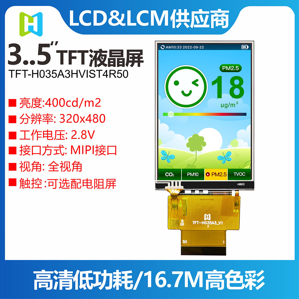 Product Description The TFT-H035A3HVIST4R50 is a 3.5-inch wide temperature IPS TFT-LCD monitor with a projected resistive touch screen with a resolution of 320X480 pixels. The module has built-in ST7796S driver IC, which supports MIPI fully compatible interface. TFT-H035A3HVIST4R50 adopts IPS panel, which has the advantage of wider viewing angle, left: 80/right: 80/up: 80/down: 80 degrees (typical value), contrast ratio 800:1 (typical value), brightness 400 nits (typical value) value), glare panel, 1:1.5 aspect ratio. Support I2C interface and single touch function. The H035A3H model has a projected resistive touch panel (PCAP), and the TFT-H035A3HVIST4R50's supply voltage (VCC) is 2.5V to 3.0V, typically 2.8V. It can operate at temperatures from -20°C to +70°C and storage temperatures from -30°C to +80°C.3.5寸TFT-H035A3HVIST4R50詳情3.jpg