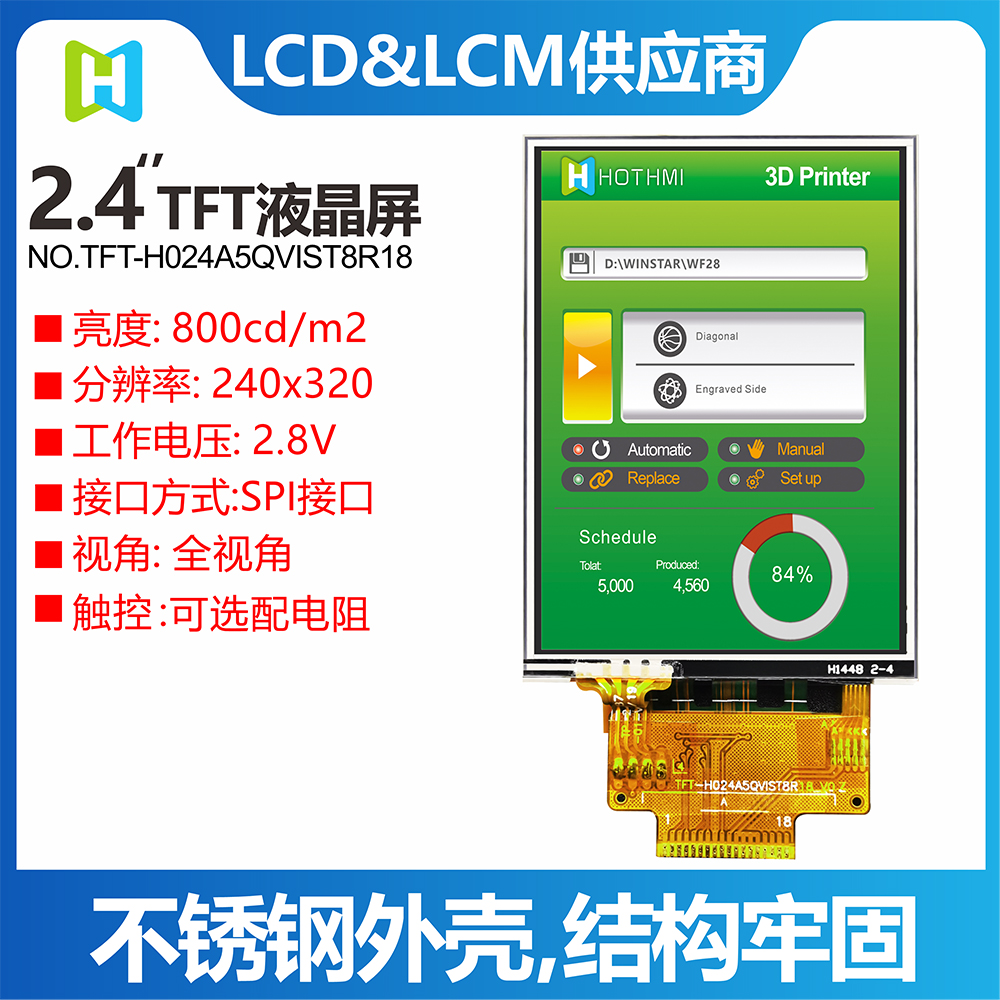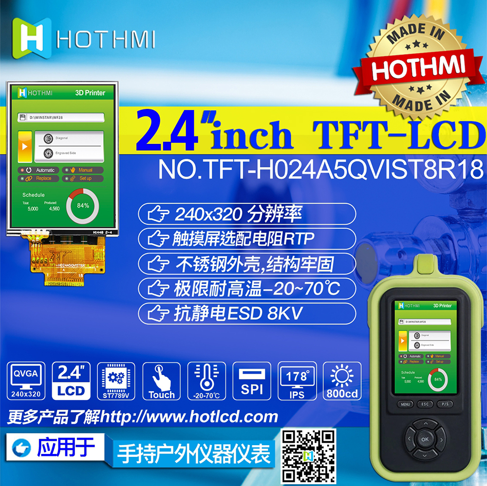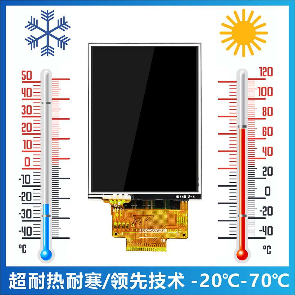 TFT-H024A5QVTST8R18 is a 2.4-inch wide warm IPS TFT-LCD display with a project-resistive touch screen with a resolution of 240x320 pixels. Module built-in ST7789V driver IC, support SPI interface. The TFT-H024A5QVTST8R18 uses an IPS panel with the advantage of a wider viewing Angle, left: 80/ right: 80/ top: 80/ bottom: 80 degrees (typical), contrast 800:1 (typical), Brightness 800 nits (typical)) value), glare panel, 16:9 aspect ratio. The H024A5 model has a projection resistive touch panel (PCAP) and the TFT-H024A5QVTST8R18 has a supply voltage (VCC) of 3.0V to 3.6V, with a typical value of 3.3V. It can operate at temperatures from -30°C to +80°C and storage temperatures from -30°C to +80°C.