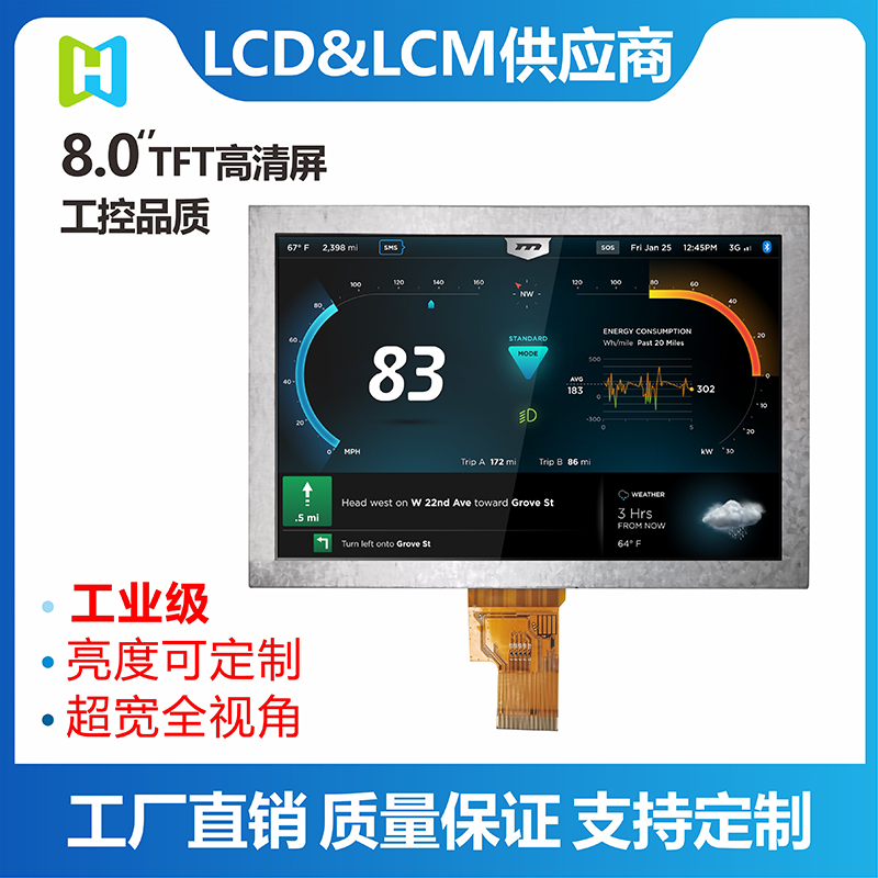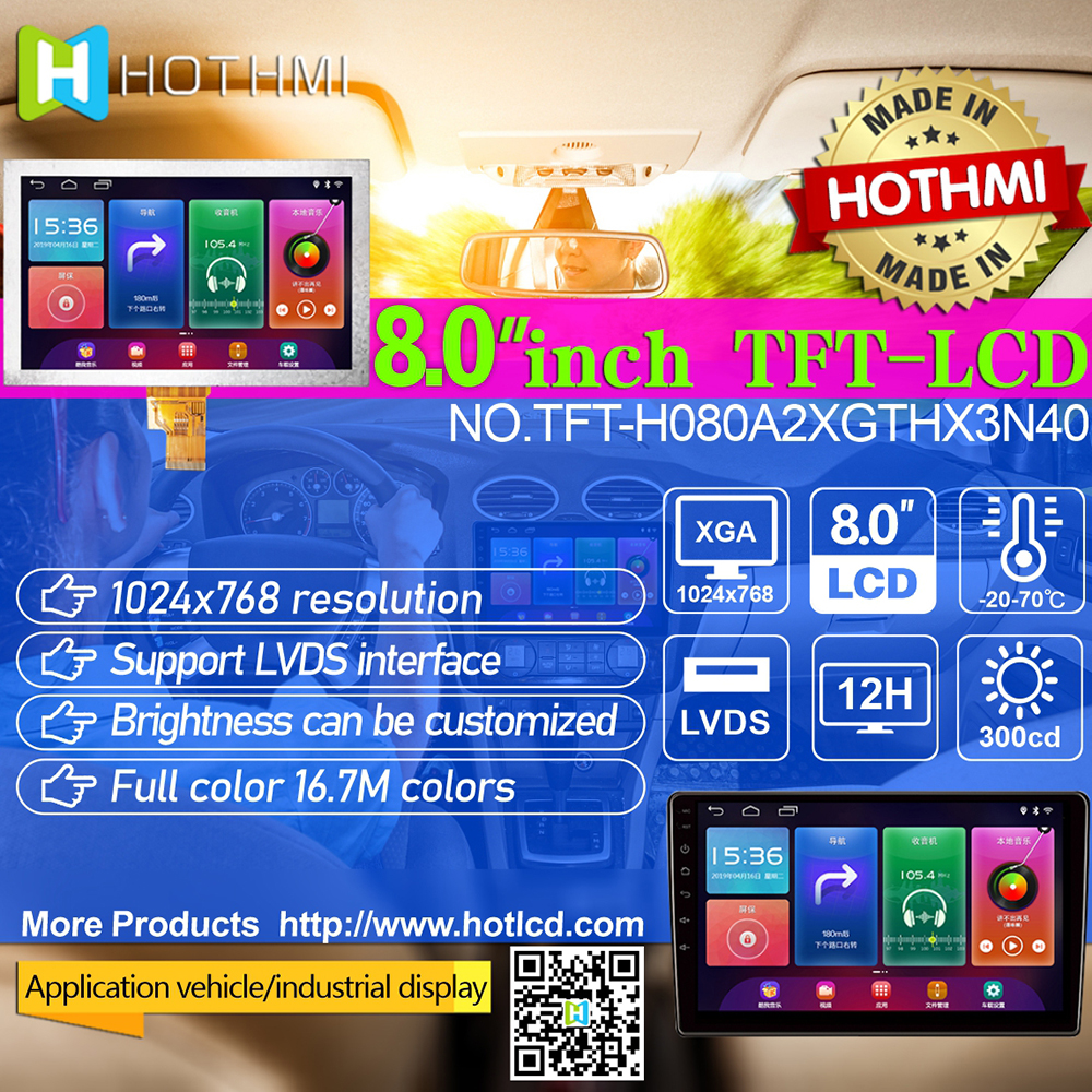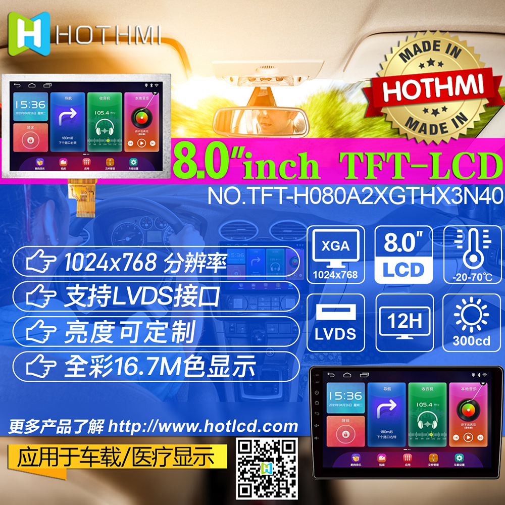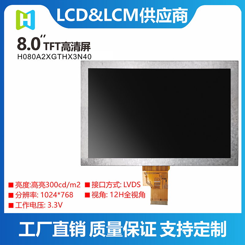 TFT-H080A2XGTHX3N40 is an 8-inch TFT LCD module with IPS panel technology. The resolution of this TFT-LCD is 1024 x 768 pixels. TFT-H080A2XGTHX3N40 module has built-in HX8282A+HX8695_B01 driver IC, supports LVDS interface, contrast ratio is 300 (typical value), and module brightness is 300 nits (typical value). The H080A2 uses IPS panel technology with wider viewing angles than TN glass. Left: 80 / Right: 80 / Top: 80 / Bottom: 80 degrees, vivid colors, high quality picture with saturation and naturalness. The driving voltage of the WF50F module is 3.3V, ordinary black/translucent liquid crystal, frosted glass, and the screen aspect ratio is 16:9. The module has an operating temperature of -30°C to +80°C and a storage temperature of -20°C to +70°C.