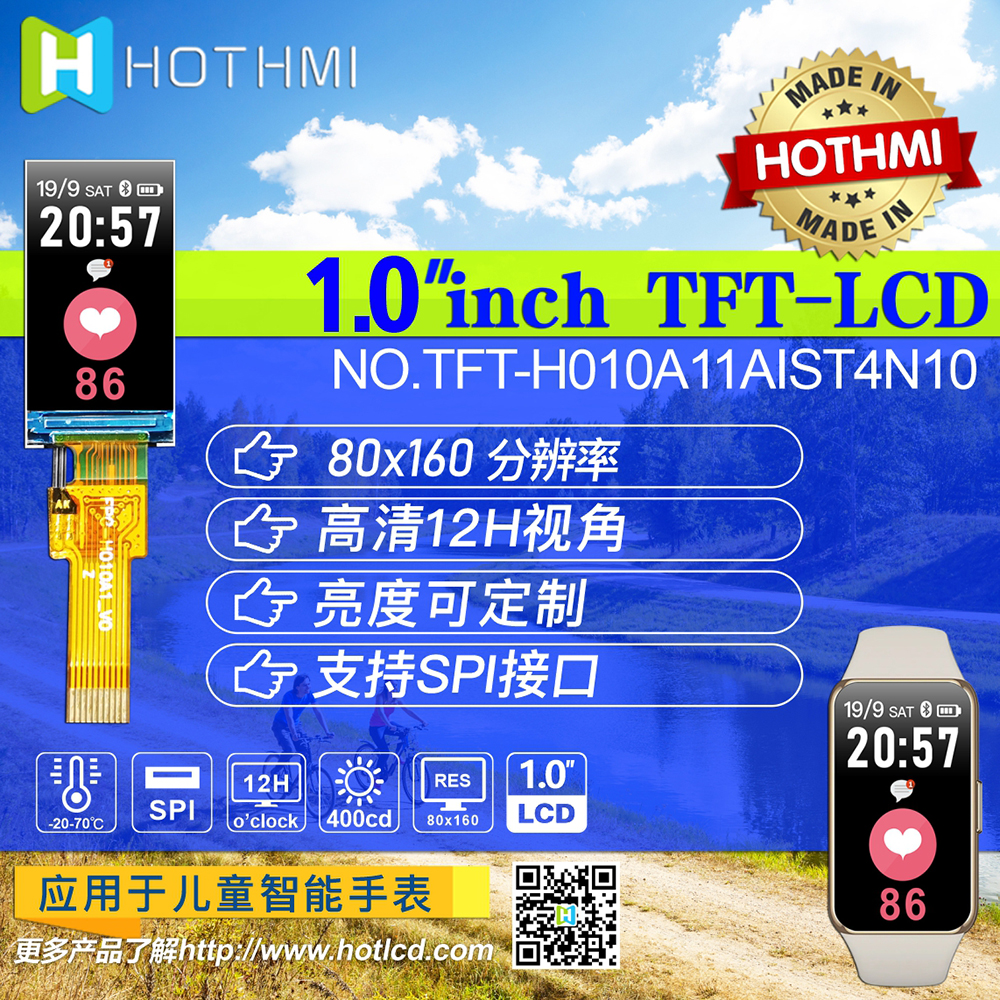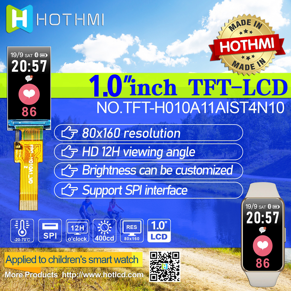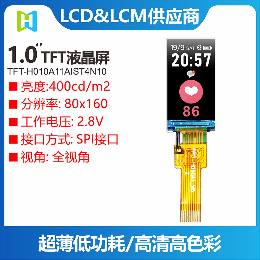 0.96-inch (1.0 ") TFT LCD (TFT-H010A11AIST4N10) is a 0.96-inch (1.0-inch) TFT color LCD module with 80x160 resolution, which is carefully designed by HOTDISPLAY,65K / 262K true color, built-in st7735s controller, high picture quality, wide viewing angle, support 3-wire SPI, 4-wire SPI serial interface, infinite peripheral circuit, only 10pinfpc connection (optional connector), 2.8V voltage, support horizontal or vertical display. All materials meet the ROHS standard of environmental protection requirements. This module can be equipped with touch screen, which is widely used in various instruments, intelligent equipment, analytical instruments, hand-held instruments, driving recorder, etc. it is suitable for a variety of single-chip development platforms, such as 8051, PIC, AVR, Arduino, arm and Raspberry PI.