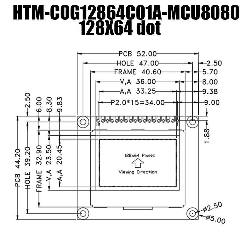 HOTLCD 128x64 graphic Chip-On-Glass (COG) Liquid Crystal Display shows blue pixels on a gray background. This transflective LCD Display is visible with ambient light or a backlight while offering a wide operating temperature range from -20 to 70 degrees Celsius. This HTM-COG12864C01A-MCU8080 display has an optimal view of 6:00, operates at 3.3V supply voltage and is RoHS compliant.