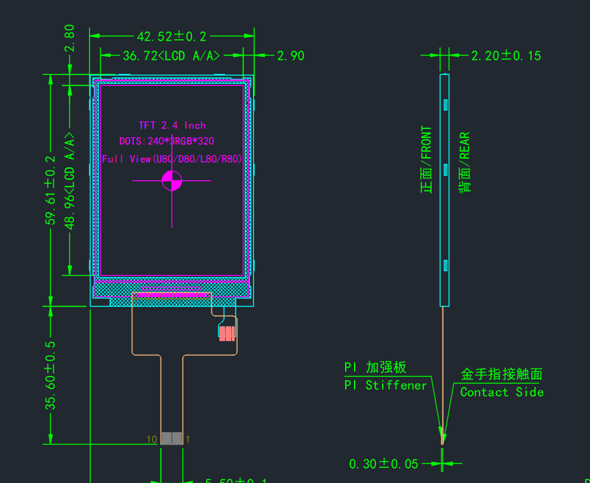 TFT-H024A16QVIST6N10 is a miniature TFT display with portrait mode, if you want to use a touch screen, please contact us for more technical support. This 240x320 TFT LCD has a brightness of 600 cd/m2 (typ.) and can operate in temperatures from -30°C to 80°C; its storage temperature range is from -30°C to 80°C.