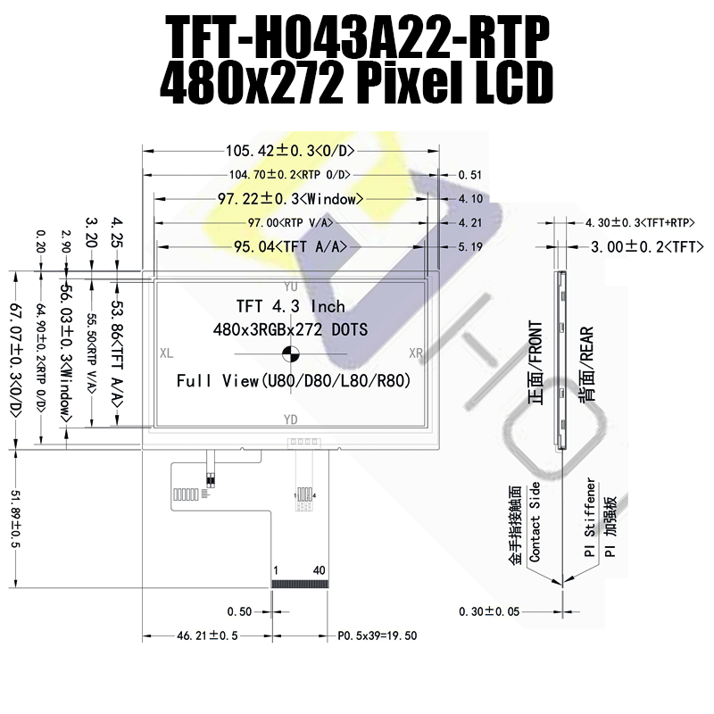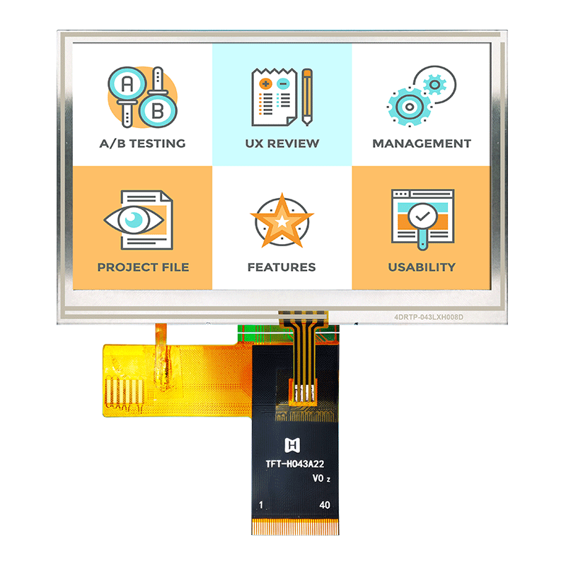This 480x272 resolution LCD TFT is a sunlight readable display with 8-bit or 16-bit parallel interface. This LCD display is equipped with a powerful backlight for visibility in bright lighting conditions, including direct sunlight. The LCD monitor also has a built-in T.B.D controller, FFC ZIF I/O connection, is RoHS compliant and has a 4-wire resistive touch screen.