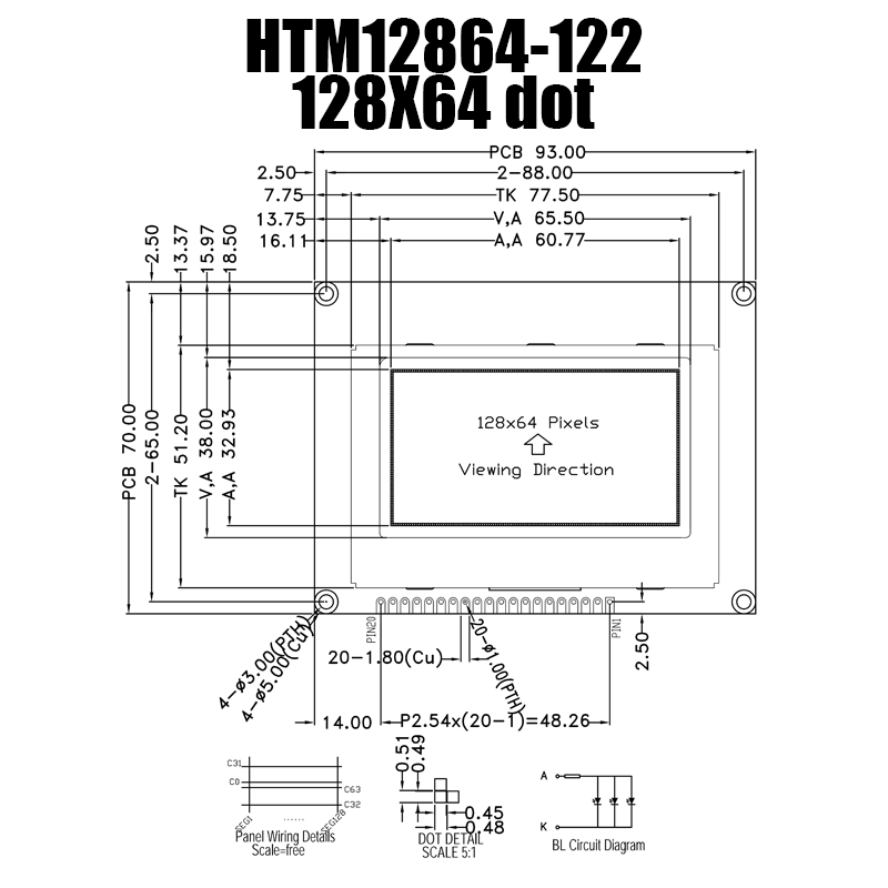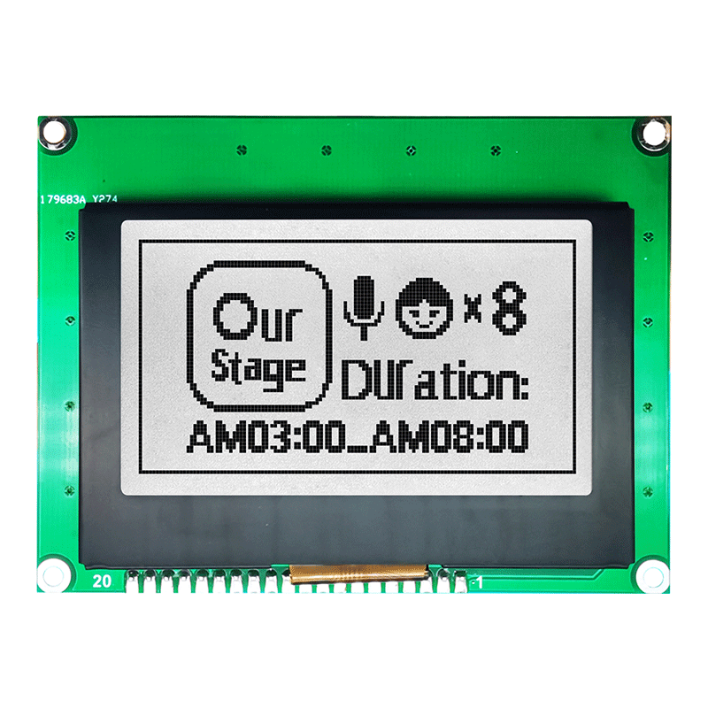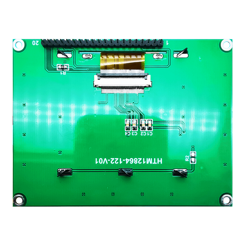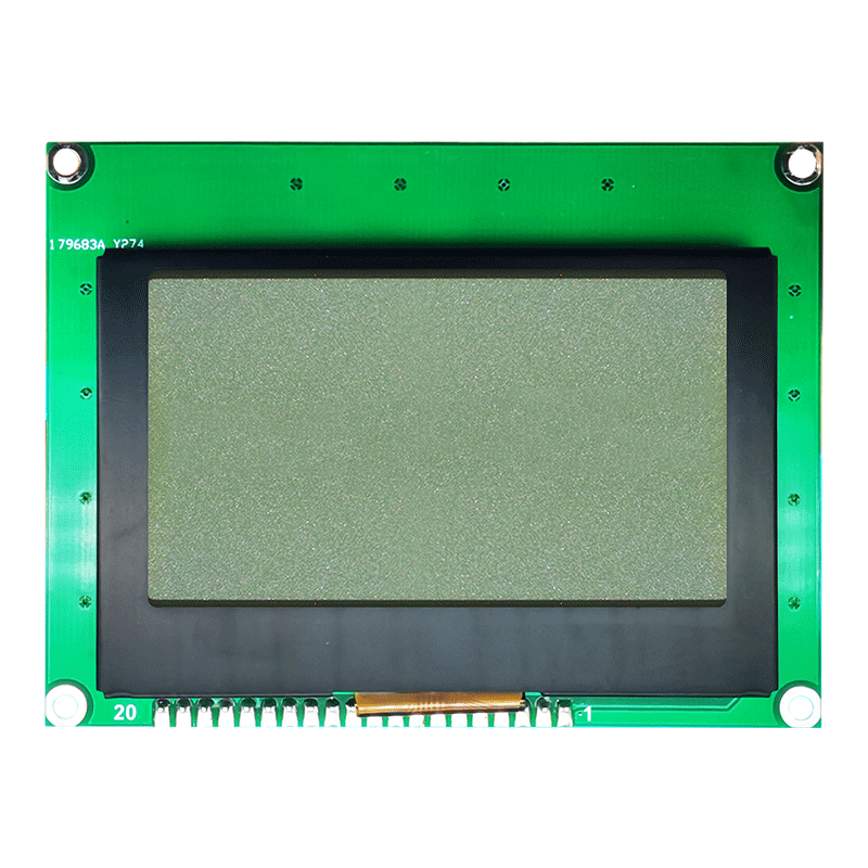 HOTLCD 128x64 graphic Liquid Crystal Display module shows dark pixels on a white background. This transflective LCD Display is visible with ambient light or a backlight while offering a wide operating temperature range from -20 to 70 degrees Celsius. This HTM12864-122-25W-N3S-V01 display includes built-in negative voltage. It has an optimal view of 6:00, operates at 3.3V supply voltage and is RoHS compliant.