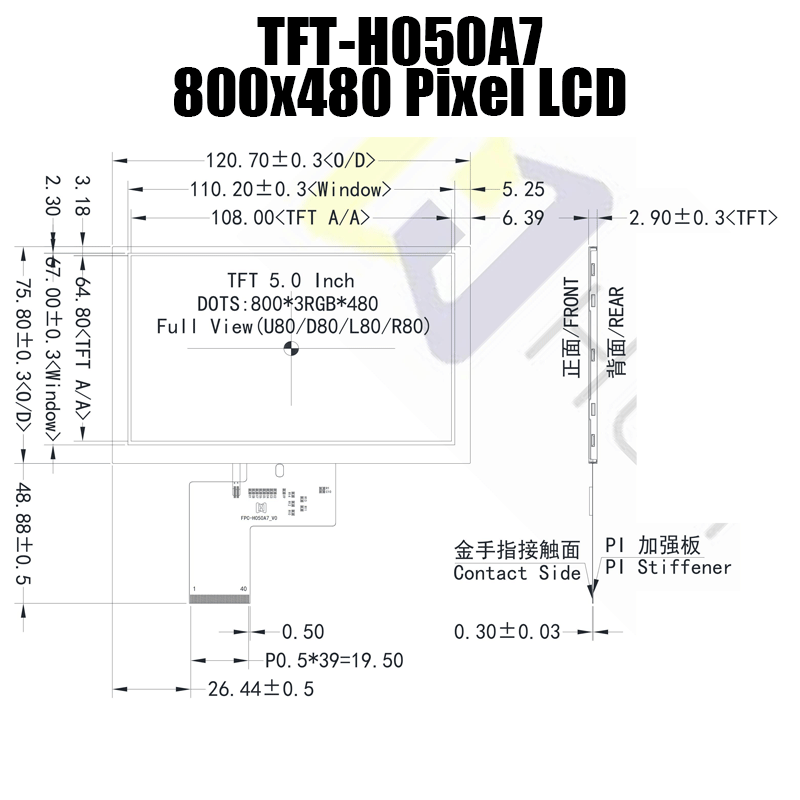 Introducing the TFT-H050A7SVISTKN40, a high-quality 5.0 inch IPS LCD display from a trusted TFT LCD display manufacturer. With an impressive 800x480 resolution, this display provides clear and vibrant visuals that are sure to enhance any project.