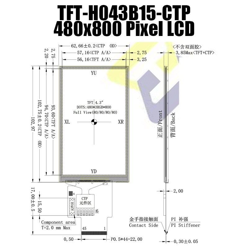 TFT-H043B15WVIST3C45 | 4.3" IPS LCD Display | TFT LCD Display Manufacturer | 480x800 resolution | -20℃~70℃ | Capactitive Touch