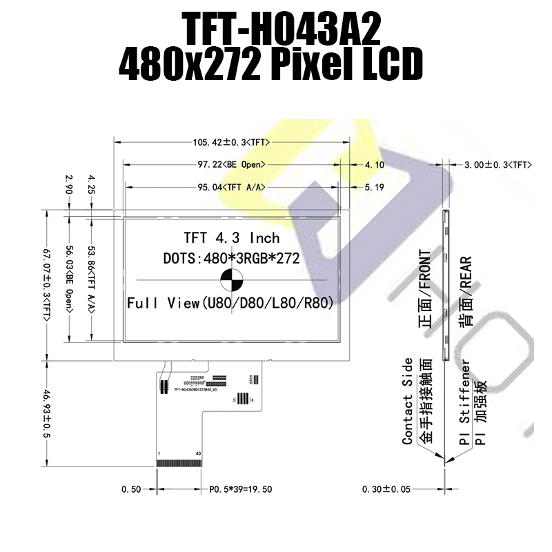 Introducing the TFT-H043A2WQISTKN40, a high-quality 4.3" IPS LCD display from a trusted TFT LCD display manufacturer. With a resolution of 480x272, this display delivers sharp and vibrant images, making it ideal for a wide range of applications.