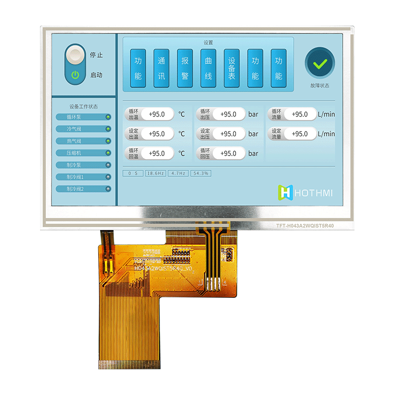 TFT-H043A2WQIST5R40 | 4.3" IPS LCD Display | TFT LCD Display Manufacturer | 480x272 resolution | -30℃~80℃ | Luminance 500cd/m2 | IC SC7283 | Interface  RGB  | sunlight readable | Resistive Touch Panel