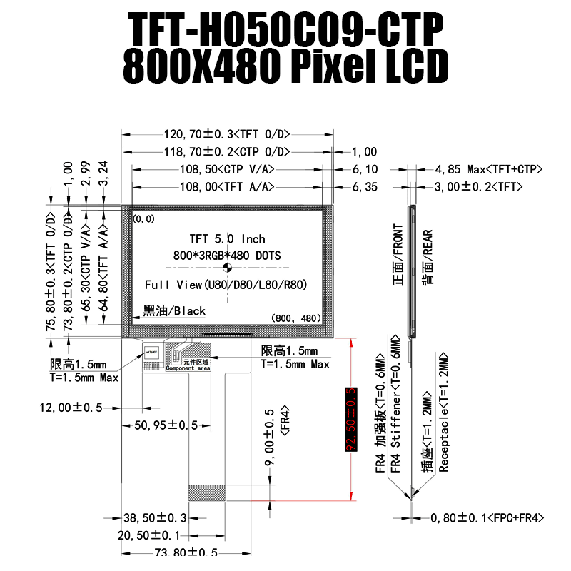 TFT-H050C09SVISTKC40 | 5.0" IPS LCD Display | TFT LCD Display Manufacturer | 800x480 resolution | -30℃~80℃ | FOR INDUSTRIAL CONTROL | CAPACITIVE TOUCH SCREEN | sunlight readable