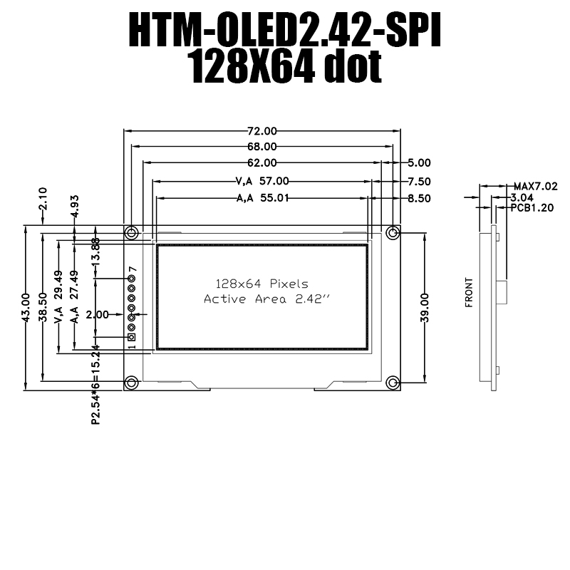 Introducing our 2.42'' OLED Display, a high-quality visual solution designed for a wide range of applications. With a resolution of 128x64 dots, this display delivers clear and detailed imagery for optimal viewing. The A.A (Active Area) measures 55.01x27.49mm, providing ample space to showcase your graphics and data.
