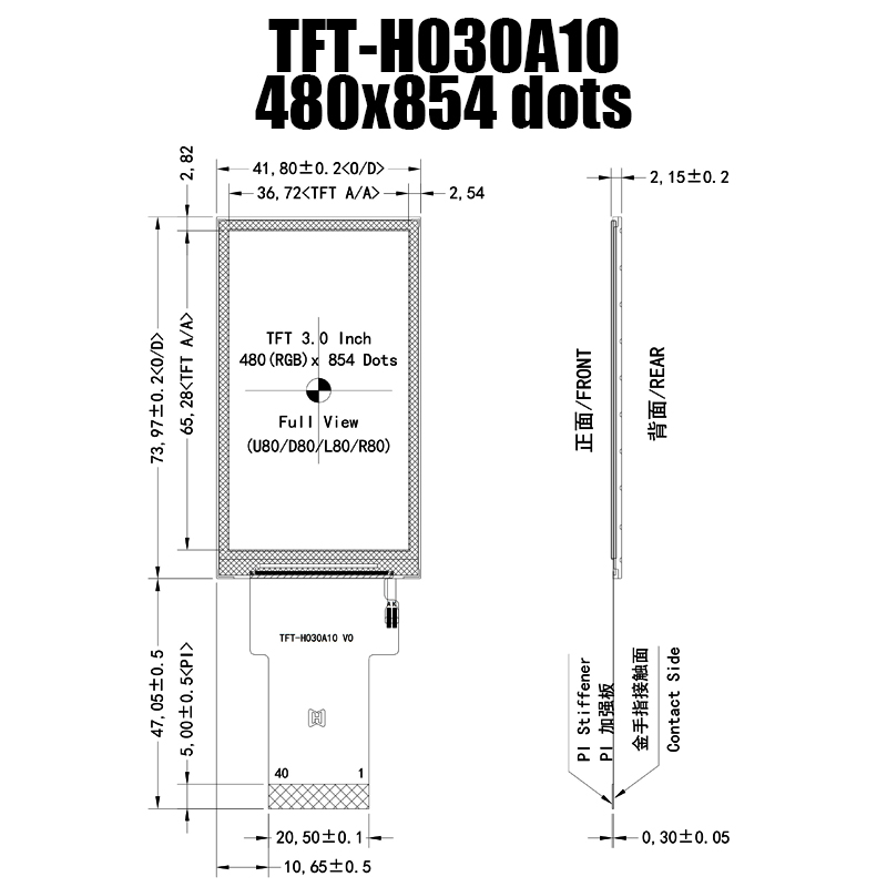 TFT-H030A10FWIST3N40 | 3.0" IPS LCD Display | TFT LCD Display Manufacturer | 480x854 resolution | -30℃~80℃ | FOR INDUSTRIAL CONTROL | Interface RGB+SPI | Wide Temperature