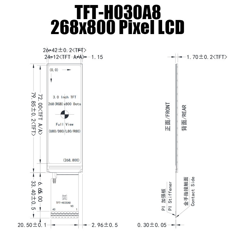 Location:Home  >  Product center  >  TFT display screen  >  Wide View TFT Display Screen  >  3.0寸 IPS全視角 268x800分辨率 寬溫 TFT液晶顯示屏 ST7701S 應(yīng)用于儀器儀表 TFT-H030A8ZCISTKN40