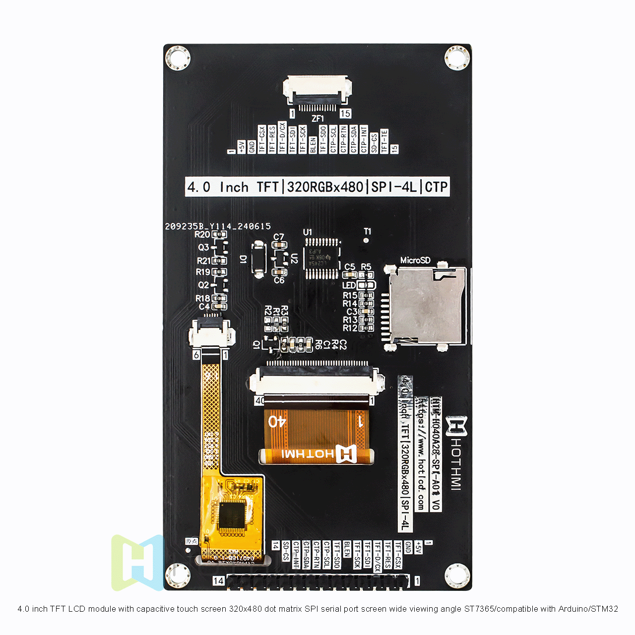HTM-H040A28-SPI-A01C is a 4.0-inch IPS LCD module with plate - capacitive touch display with a resolution of 320X480 pixels. It uses ST7365 display driver IC, plug-in PIN pins, and is also compatible with FPC cables and can be used with matching connectors. The wide viewing angle used in this display ( U70/D60/L70/R70) technology provides full viewing angle and excellent color performance, allowing you to easily watch from all angles without distortion. The display has a high contrast ratio of 500:1, capable of displaying deep blacks and vivid colors. With a brightness of up to 330cd/m2, it can be read under sunlight. FPC connection (optional connector), 3.3V voltage, supports vertical screen display. All materials comply with RoHS environmental protection standards. The module is widely used in various instruments, industrial computers, smart devices, etc. It is suitable for a variety of microcontroller development platforms such as C8051/Arduino/STM32.