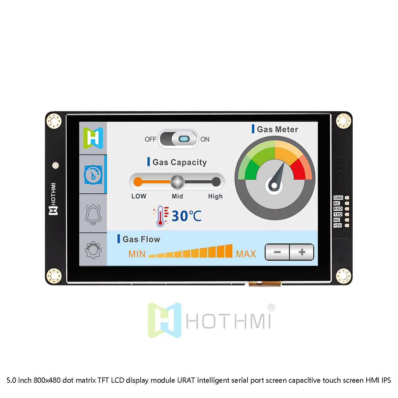 HTM-H050A1-UART-A5C is a 5.0-inch IPS TFT display module with a resolution of 800x480 pixels. It is a display with intelligent display function, UART interface, and human-machine information exchange function. In addition to the controller, our HMI display also integrates MCU function. The MCU receives commands sent by the main control board (client) through the UART interface, and then displays text, images or animations according to these predefined instructions. The MCU on the main control board (client) does not require complex programming or execution specifically for image display. You can easily create text, images or animations using our GUI design software - UI Editor. No programming skills are required. This model is also configured with capacitive touch, multi-touch, smooth and unobstructed.