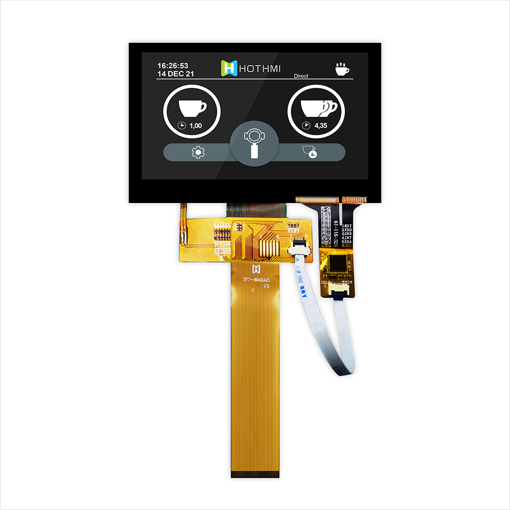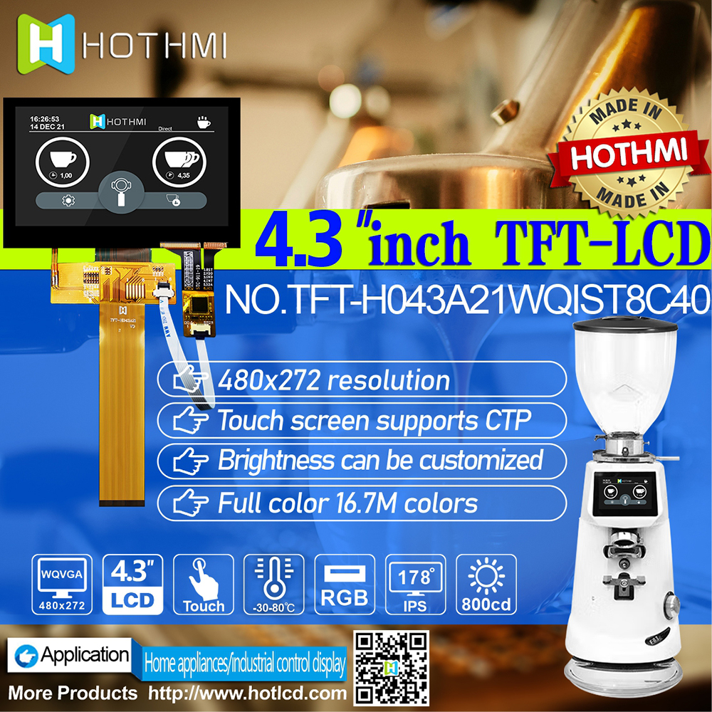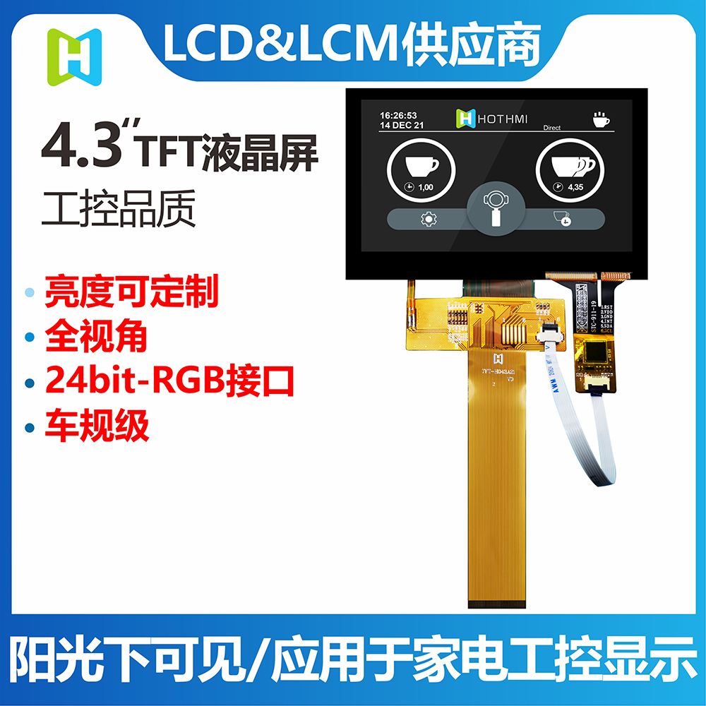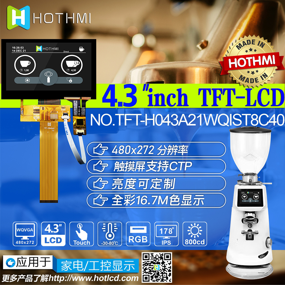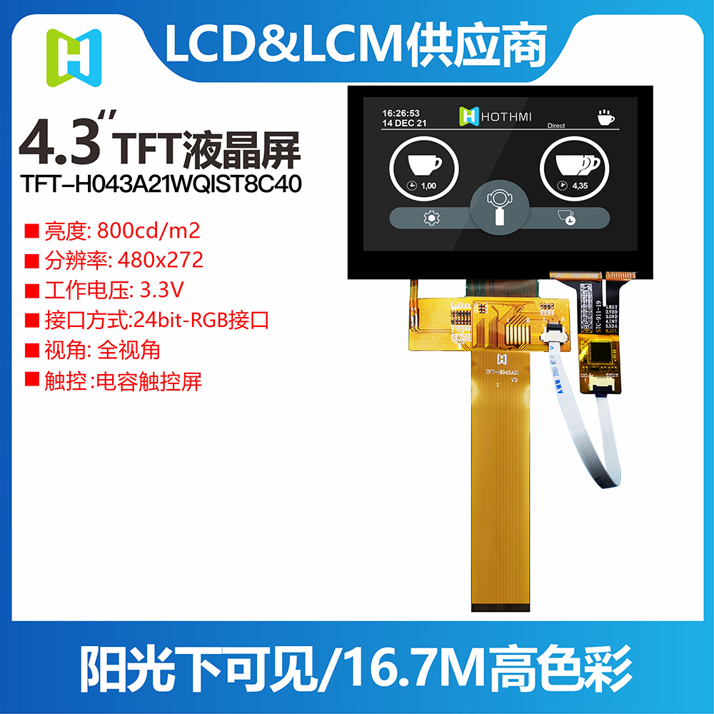 4.3寸TFT彩屏 /480*272分辨率 /全視角IPS工藝 /RGB 24Bit/IIC接口 /TFT-H043A21WQIST8C40/應用于咖啡機,家電,工控,醫(yī)療顯示設備,陽光下可見