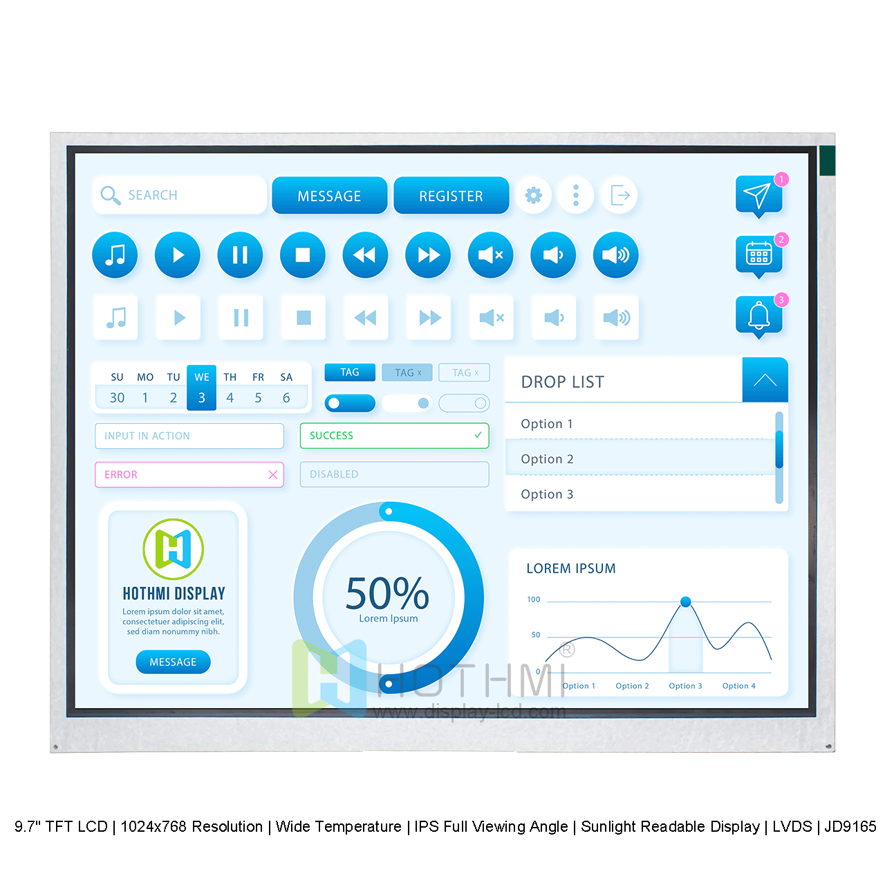 9.7英寸TFT 液晶顯示屏 | 1024x768 分辨率  | 寬溫 | IPS全視角 |  陽(yáng)光下可讀顯示屏 | LVDS | JD9165